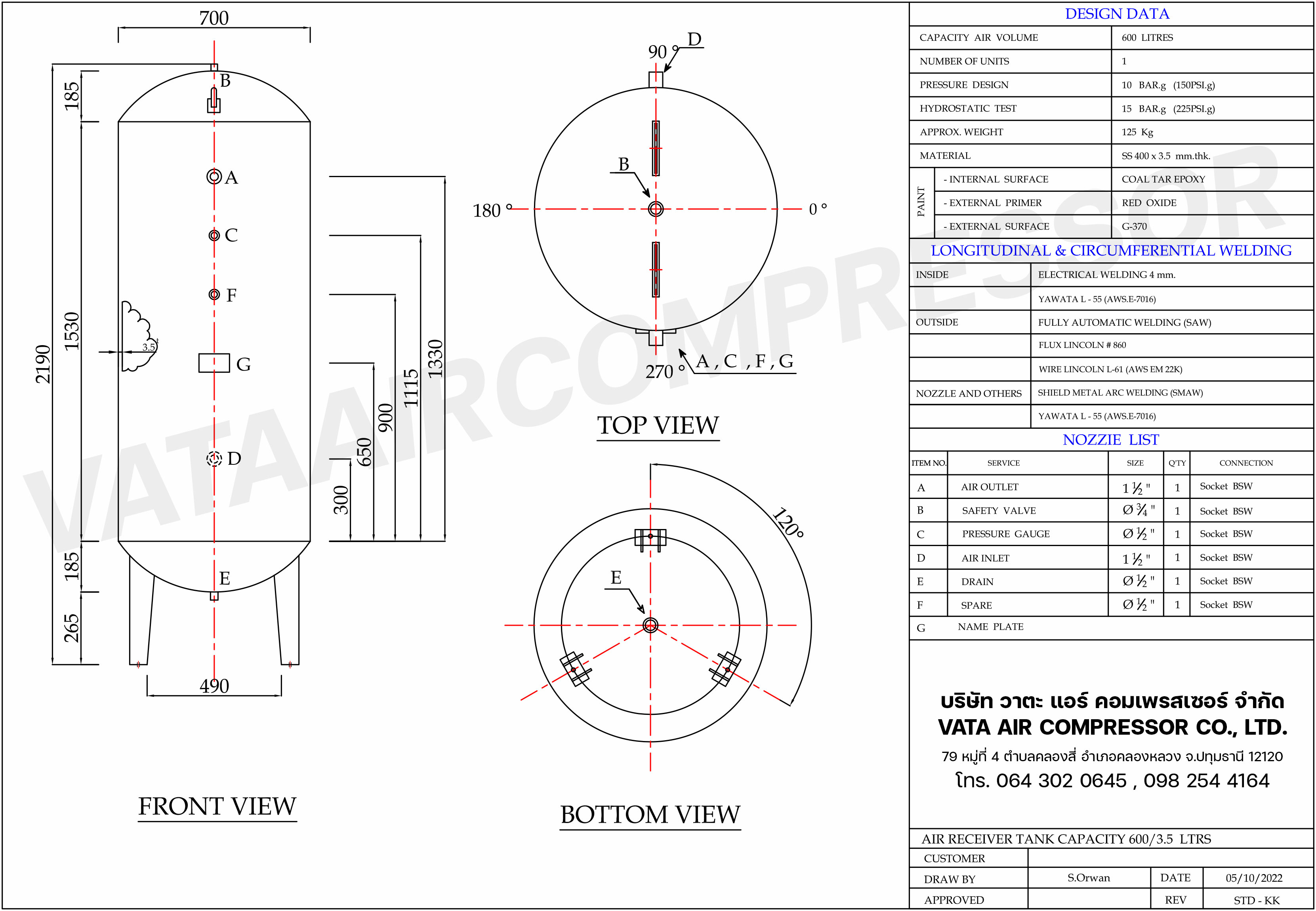 ถังพักลม Air Tank รุ่น AT-600L ขนาด 600 ลิตร
