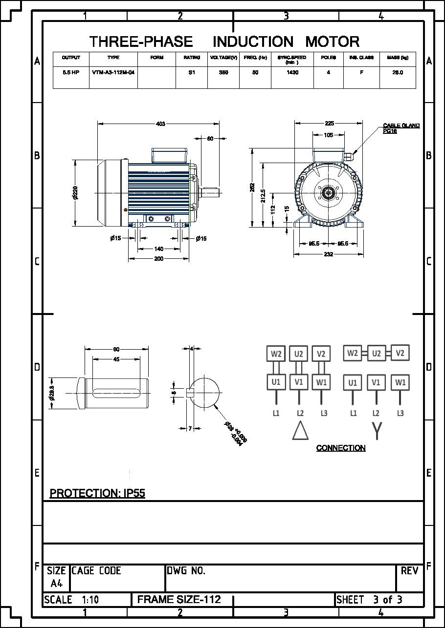 มอเตอร์วาตะ VATA รุ่น VTM 5.5HP ขนาด 5.5 แรงม้า 4P ไฟฟ้า 3 เฟส 380V IP55
