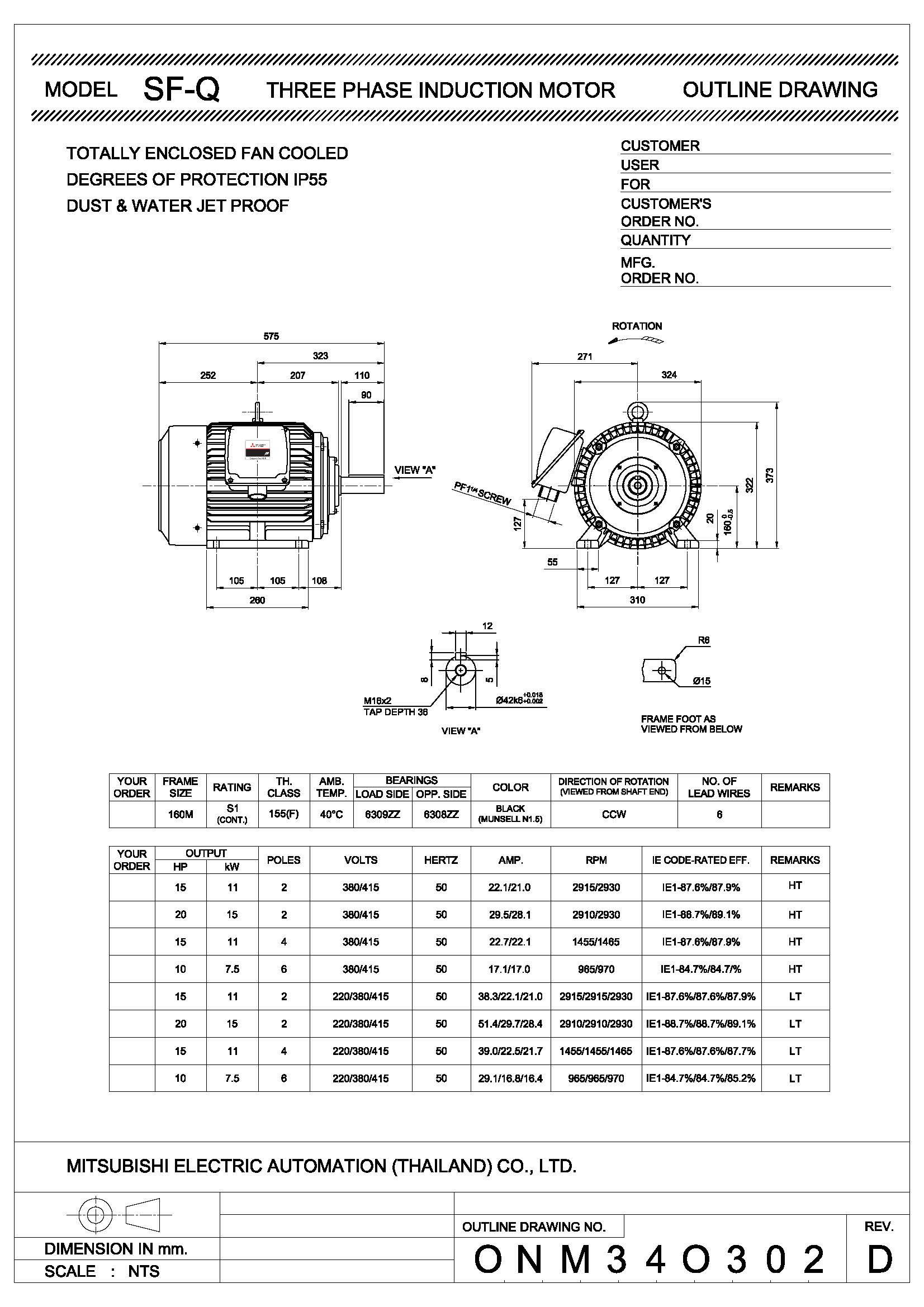 มอเตอร์มิตซูบิชิ MITSUBISHI รุ่น SF-Q ขนาด 15 แรงม้า 4P ไฟฟ้า 3 เฟส 380/415V (HT)