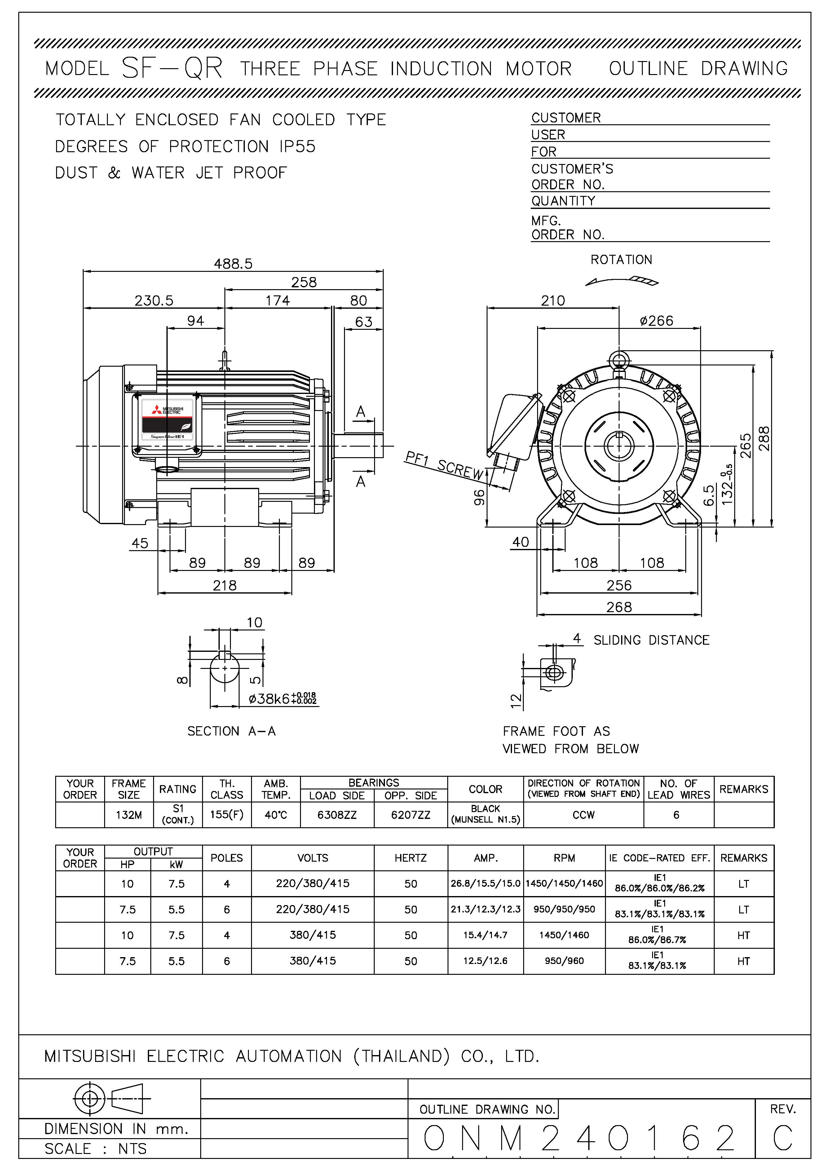 มอเตอร์มิตซูบิชิ MITSUBISHI รุ่น SF-QR ขนาด 10 แรงม้า 4P ไฟฟ้า 3 เฟส 380/415V (HT)